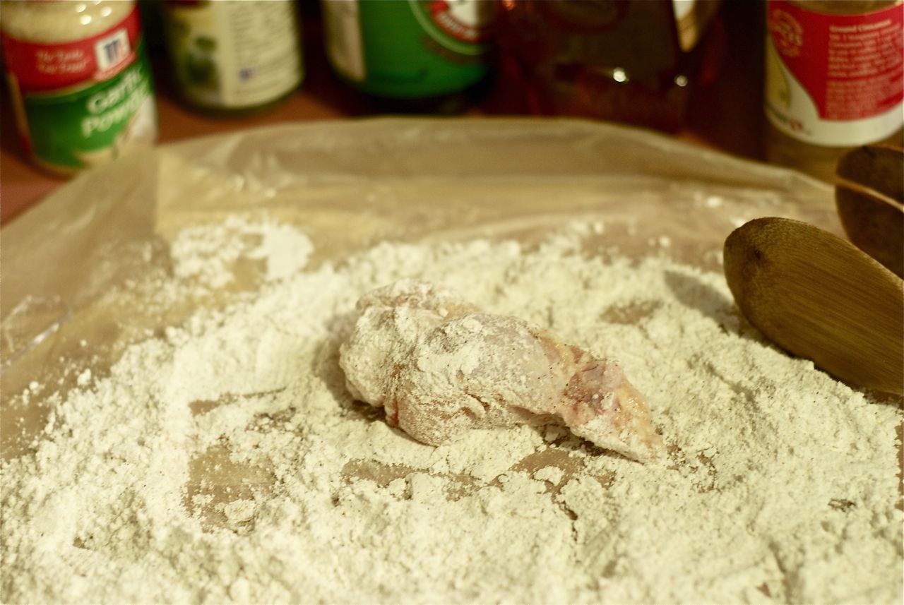 I have an electric skillet, which is perfect for frying, if you have one too, set that baby to 350˚F. You can also use a heavy frying pan, or a large saute pan about 3-4 inches deep on medium heat. Use anything where the chicken will fit, and be covered by the frying oil. The oil should take about 10 minutes to properly heat, but you can always check by sprinkling a little of the flour in the oil. If it sizzles immediately then it is ready to work. While you wait for the oil to heat you can flour the chicken.