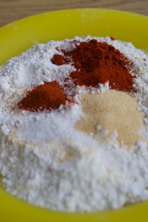 Is that a plastic bag you put the flour on? Why yes it is. Flouring (putting the batter) on the chicken can be such a mess to clean up. My Mamaw taught me this little trick, mostly for quick clean up. Just make sure you rinse and dry the plastic bag before you use it. Place the flour on the inside of a pre washed plastic bag, and add salt, garlic powder, paprika, and pepper. Mix. Dredge the chicken, coating it in flour mixture, and set aside in a bowl or large plate. Once finished you should be able to lift the handles of the plastic bag leaving the left over flour on the inside of the bag, and throw it away. Quick and easy clean up.